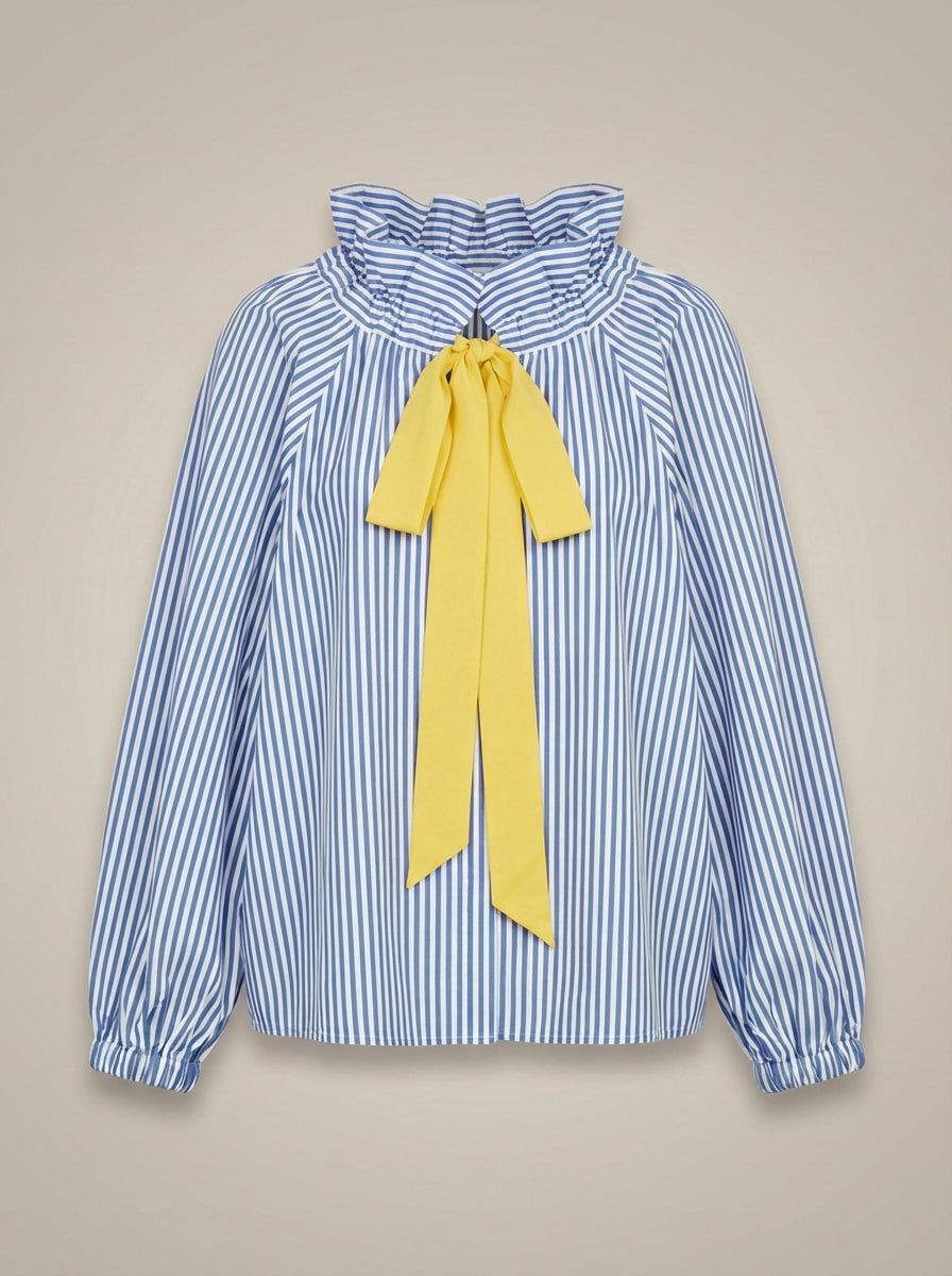 Deze damesblouse heeft een geruit patroon dat wordt geaccentueerd door een opvallende kraag met ruches en een opvallende strik. Het silhouet is ontworpen om op te vallen en tegelijkertijd een gestructureerde en doelbewuste look te behouden. Geschikt voor gestileerde dagkleding, creatieve werkomgevingen of gelegenheden waar een opvallende top voor visuele interesse zorgt.