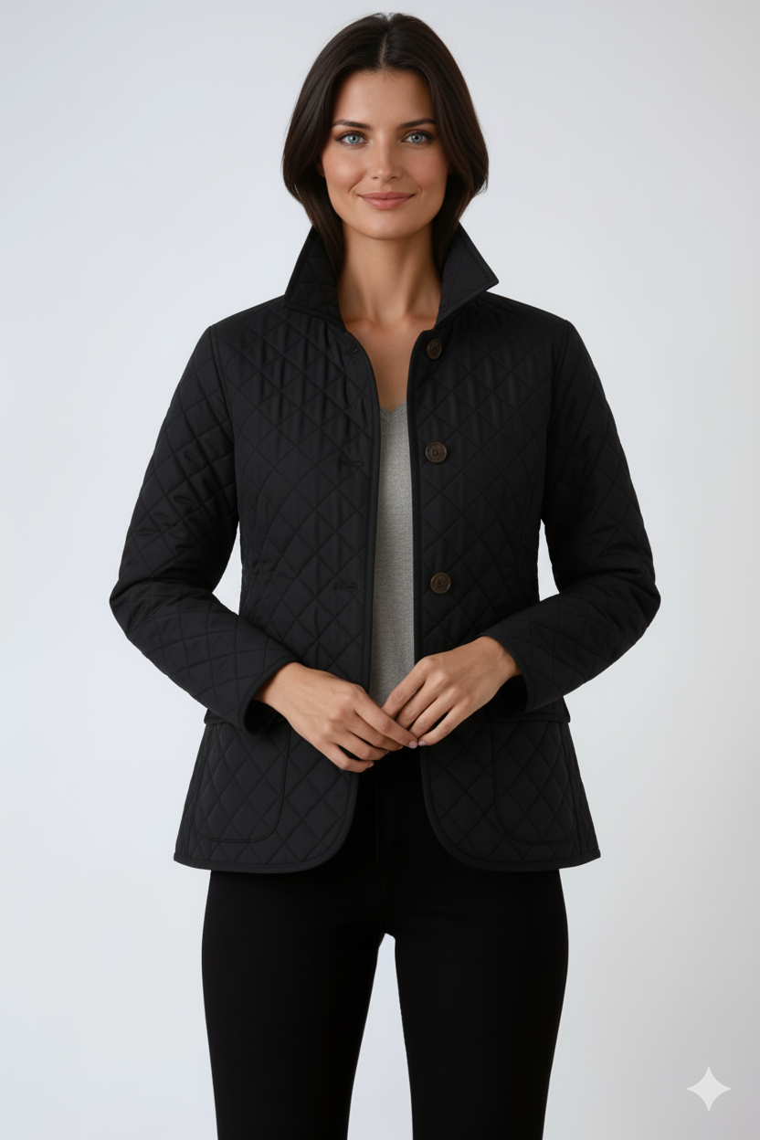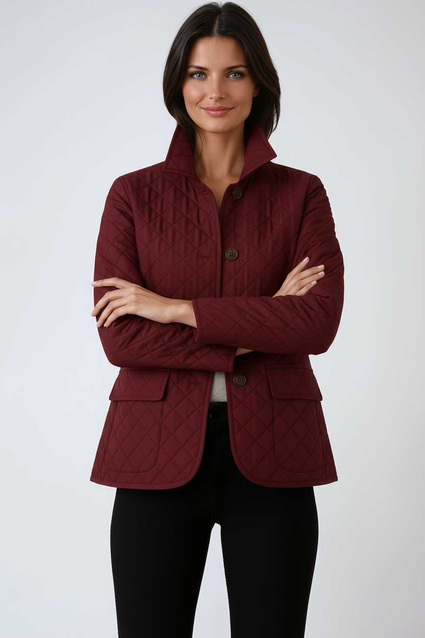 Deze stijlvolle dames tussenjas combineert elegantie en functionaliteit. De jas is licht gewatteerd voor extra comfort tijdens de tussenseizoenen en voorzien van een klassieke knoopsluiting. Het subtiele ruitpatroon geeft een tijdloze en nette uitstraling, ideaal om zowel casual als zakelijk te dragen.