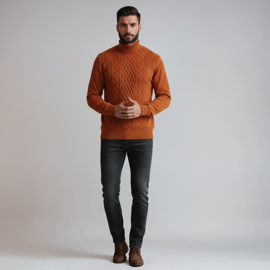 Deze heren coltrui brengt warmte en elegantie samen in één stijlvol ontwerp. Het verfijnde kabelpatroon geeft de trui een klassieke uitstraling, terwijl de col zorgt voor extra comfort tijdens koude dagen. Ideaal voor zowel een nette outfit als een casual look.