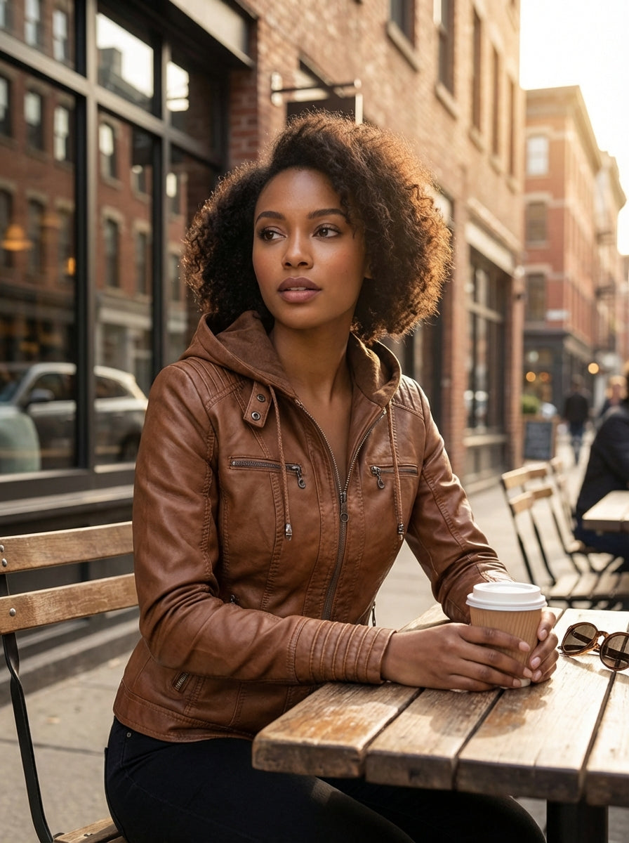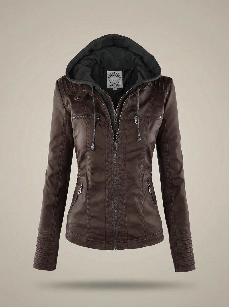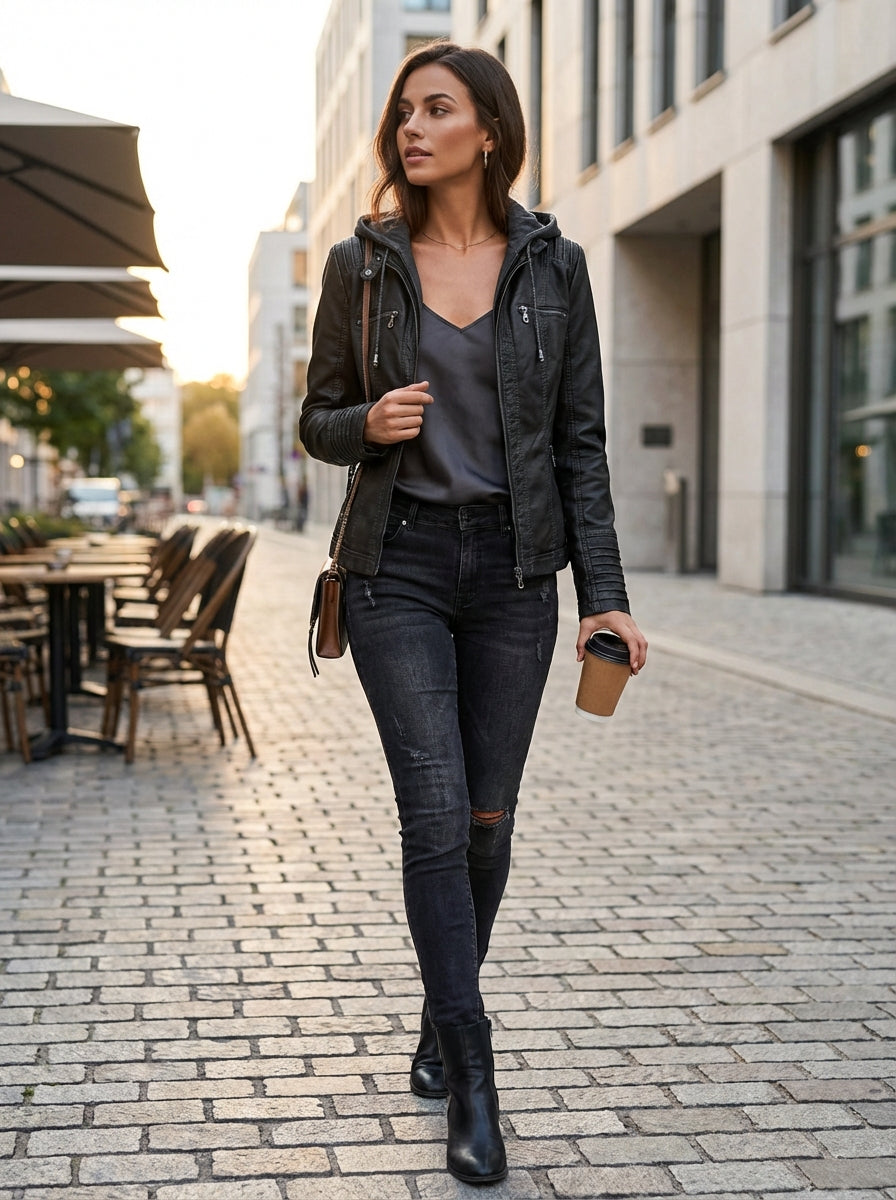 Dit damesbikerjack met capuchon heeft een gestroomlijnd silhouet met opvallende ritssluitingen. Het ontwerp is geschikt voor dagelijks gebruik en biedt een flexibele styling voor wisselende omstandigheden. Geschikt voor uitstapjes in de stad, casual plannen of gelaagde looks tijdens het tussenseizoen.