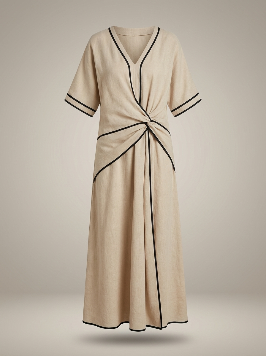 Deze maxi-jurk voor dames heeft een V-halslijn en een knoopdetail in de taille, wat zorgt voor een zacht geaccentueerd silhouet. De soepel vallende snit beweegt op natuurlijke wijze bij elke stap en zorgt voor een verfijnd look die ideaal is voor warme dagen en ontspannen uitstapjes. Combineer de jurk met sandalen of eenvoudige accessoires voor vakanties, informele bijeenkomsten of evenementen overdag.
