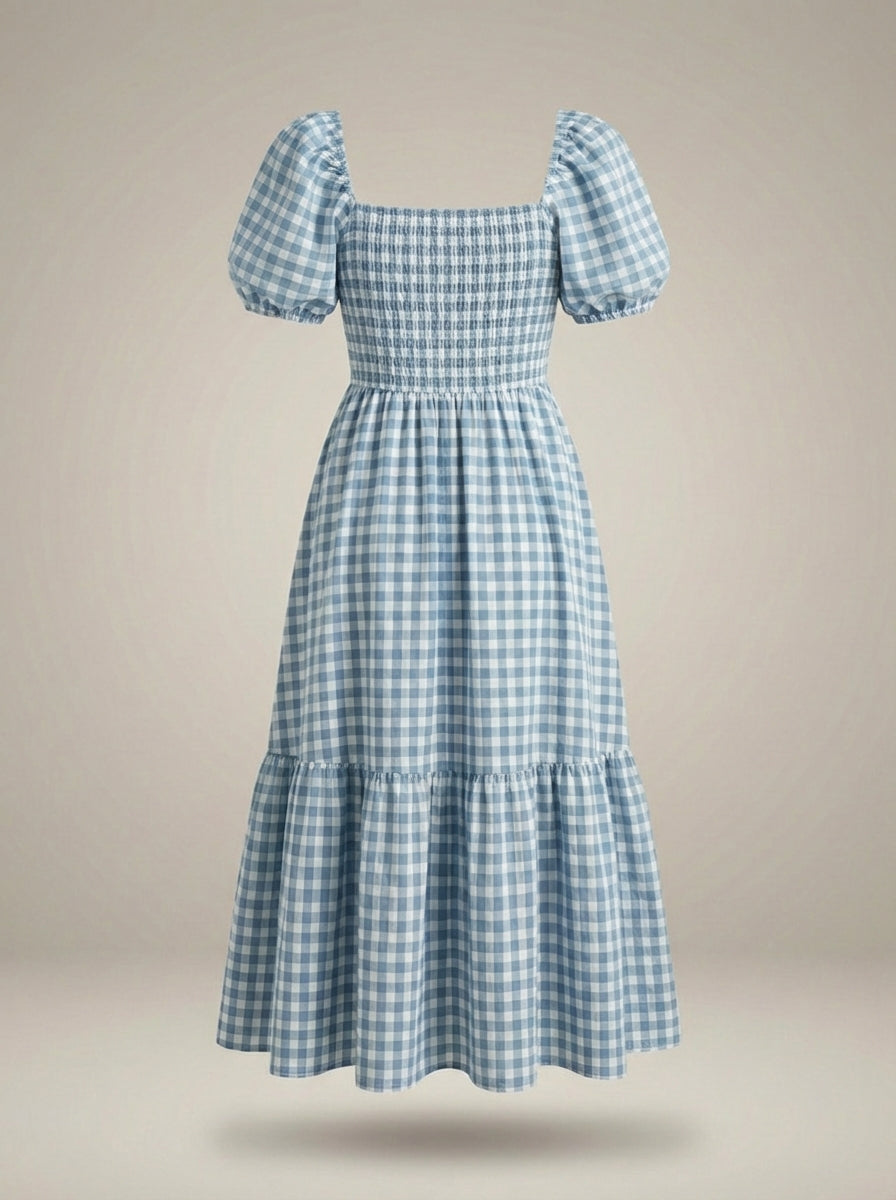 Deze midi-zomerjurk voor dames met smokwerk heeft een evenwichtig silhouet met zacht gevormde pofmouwen en een vloeiende rok. Het ontwerp zorgt voor bewegingsvrijheid en behoudt tegelijkertijd een duidelijke, gedefinieerde contour. Geschikt voor dagjes uit, seizoensgebonden evenementen of ontspannen gelegenheden waar een verfijnde uitstraling de voorkeur heeft.