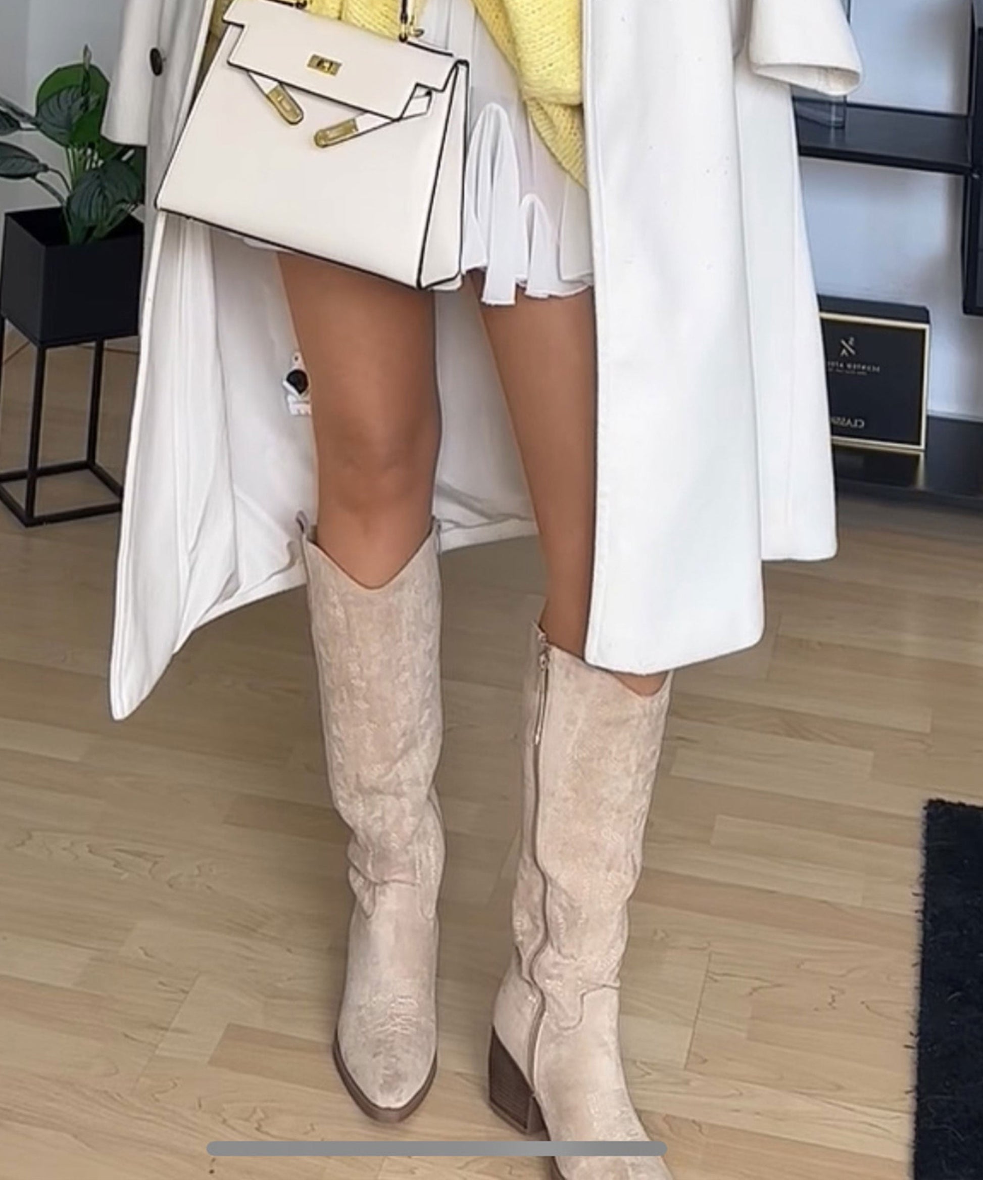 De Liz hoge cowboylaarzen zijn een echte eyecatcher voor dames die houden van een stoere, maar toch elegante look. Het hoge model en de western geïnspireerde details geven deze laarzen een unieke uitstraling. Perfect om casual te dragen met jeans of stijlvol te combineren met een jurk of rok.