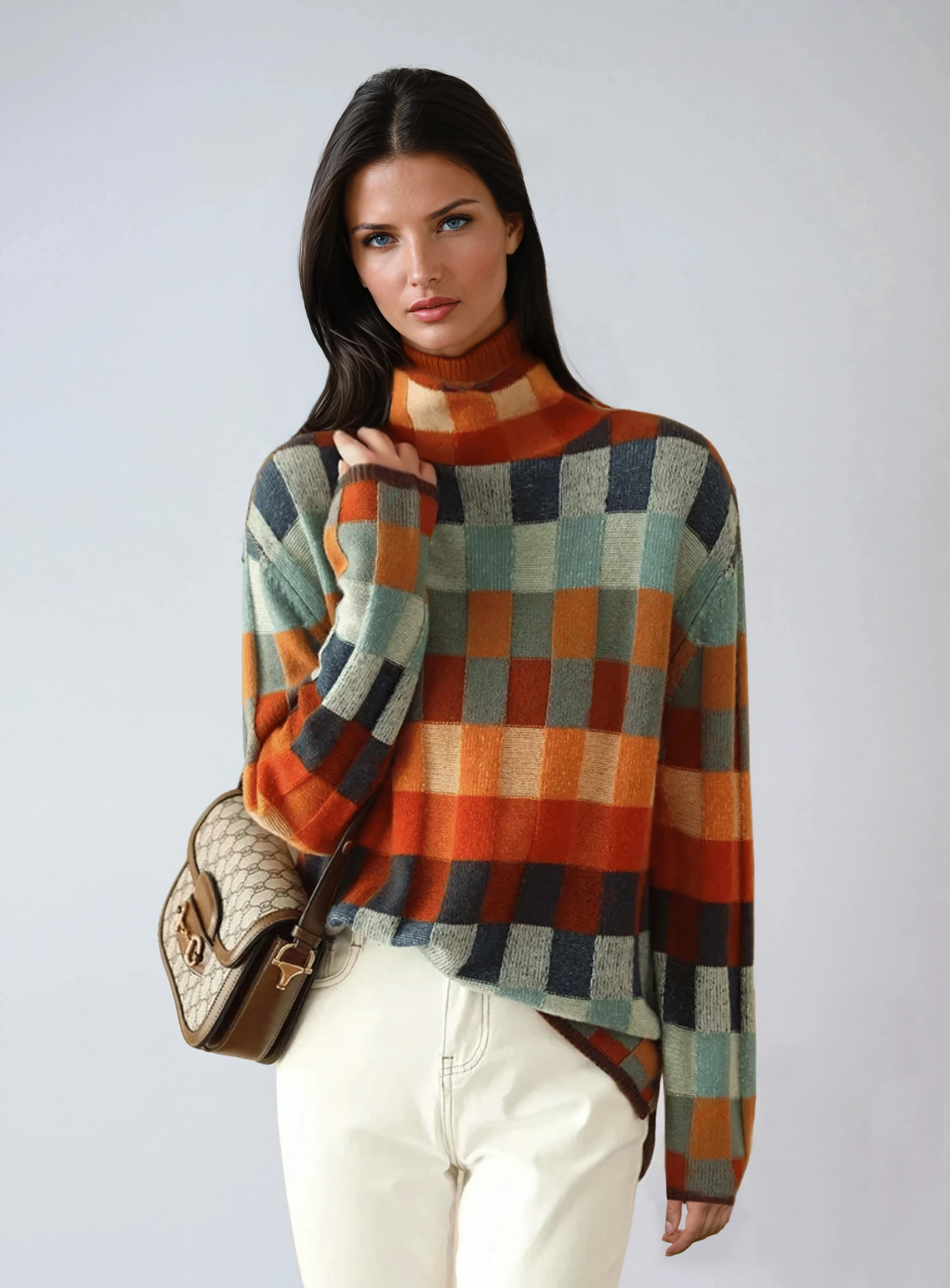 De Lyn coltrui combineert warmte met een opvallende stijl. Deze trui heeft een hoge hals en een kleurvol geruit patroon, wat hem een speelse en trendy uitstraling geeft. Dankzij de zachte stof en comfortabele pasvorm is dit een perfecte keuze voor koude dagen, zowel casual als chic.