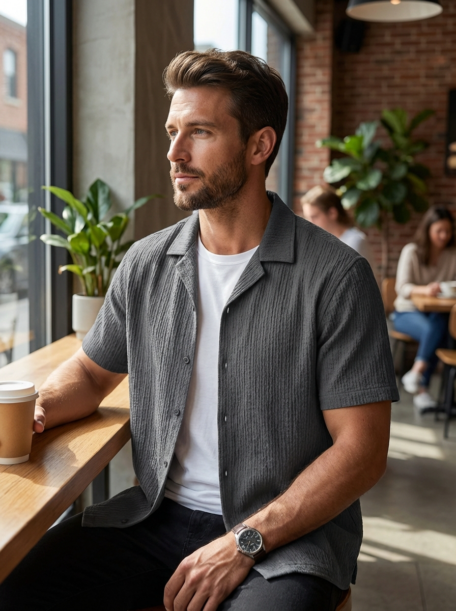 Dit herenoverhemd met korte mouwen heeft een ontspannen silhouet en een strakke, open halslijn die de nonchalante uitstraling versterkt. De korte mouwen en de soepele pasvorm zorgen voor een evenwichtige look die ideaal is voor warm weer. Geschikt voor informele uitstapjes, vakanties of gezellige bijeenkomsten; het overhemd past naadloos bij zowel dag- als avondkleding.